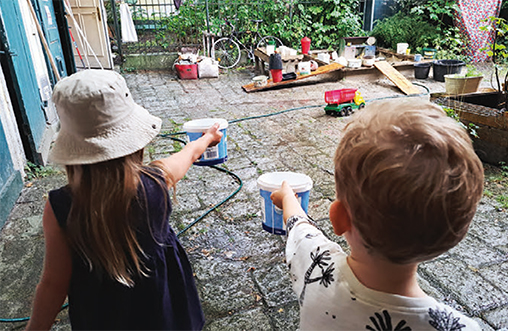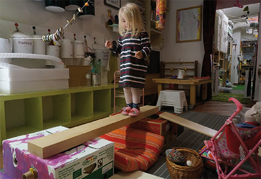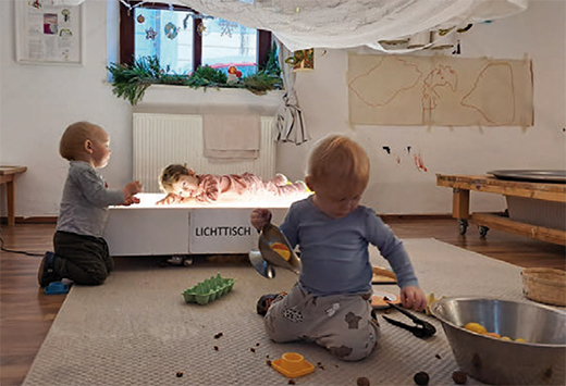 Unperfektheit und Kreativität werden zum Statement gegen Langeweile von Bildungsräumen, in denen Kinder durch Gleichheit und Wiederholung Stereotype produzieren, statt sinnliche Erfahrungen entfalten und sichtbar machen zu dürfen. Da wird das Ikea-Regal, einmal umgedreht, zum Flugzeug, der Elektroschlauch zum Wasserschlauch fürs Feuerlöschen oder das Pikler-Dreieck zum Löwenkäfig. Geschredderte Papierstreifen werden zur Schneelandschaft, und zerknitterte Papierbälle fungieren mit Obstnetzen überzogen als Meisenknödel für das winterliche Vogelspiel. In der räumlichen Individualität spiegelt sich der schöpferische Ausdruck der Kinder und Erwachsenen. Das kreative Umfeld sprüht voller Lebendigkeit und ist ein Ort für vielfältige Materialien wie Bonbonpapier, Steine, Muscheln, Stoffreste, Fell, Wolle, Korken, Perlen, Federn, Schneckenhäuser, Knöpfe, getrocknete Blüten oder kleine Haushaltsgegenstände. Dinge zum Anfassen, Vergleichen, Sortieren, Gestalten und Ordnen, welche die 100 Sprachen der Kinder anregen und Gedanken, Erkenntnissuche, Ideen und Forschungen der Kinder möglich machen.