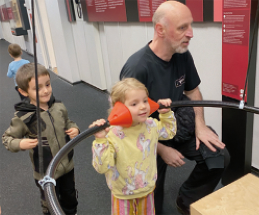 Der Himmel ist grau, und es ist ungemütlich kalt. Unsere Stimmung ist jedoch bestens, als wir den Eingang zum Science Center Spectrum im Berliner Ortsteil Kreuzberg entdecken. Schon von Weitem hatte uns das Wahrzeichen des Deutschen Technikmuseums den Weg gewiesen: ein Transportflugzeug der Alliierten aus der Zeit der Berliner Luftbrücke, das auf dessen Dach montiert ist. Schnell sind Jacken und Rucksäcke in der Garderobe verstaut und die Eintrittskarten kontrolliert. Nach einem ausführlichen Blick auf das Foucaultsche Pendel im Erdgeschoss gelangen wir zu den interaktiven Experimentierstationen zum Themenkreis Musik und Schall in der oberen Etage. Eine Hinweistafel im Eingangsbereich informiert uns darüber, dass wir ständig von Schall umgeben sind. Aber was ist Schall eigentlich? In den nächsten anderthalb Stunden werden wir ihn, je nach Schwingungsform, als Knall, Geräusch, Klang oder Ton hören, fühlen, sichtbar machen und selbst erzeugen. Noch sind wir an diesem frühen Morgen die einzigen Besucher:innen und können unseren Interessen frei nachgehen. Einzeln oder zu mehreren nähern sich die Kinder den Experimentierstationen und deren Möglichkeiten. Die letzte Scheu verschwindet, nachdem wir ihnen mehrfach versichert haben, dass es nicht nur erlaubt, sondern ausdrücklich erwünscht ist, alles anzufassen, sämtliche Knöpfe zu drücken, Regler zu bedienen und sogar auf das Gestell der Klangröhren zu klettern, um diese besser anschlagen zu können. Abwechselnd nutzen sie den dafür vorgesehenen Stick. Ich bin erstaunt, wie gut sich das von selbst regelt. Auch der Erzieher Sven Giese darf den Stick kurz haben und verblüfft die Kinder, indem er »Alle meine Entchen« auf den Röhren spielt.